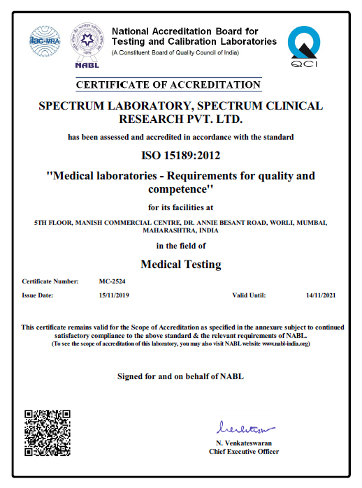Spectrum Laboratory is run by medical and technical experts with specialized training in Laboratory Medicine. It uses state-of-art equipment capable of detecting potentially serious health problems.